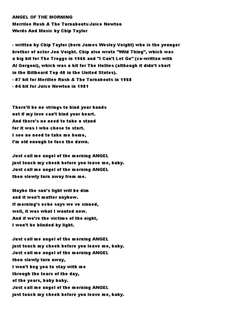 Just Call Me Angel Of The Morning : Angel Of The Morning Juice Newton Lyrics Youtube : Maybe the sun's light will be dim and it won't matter anyhow.